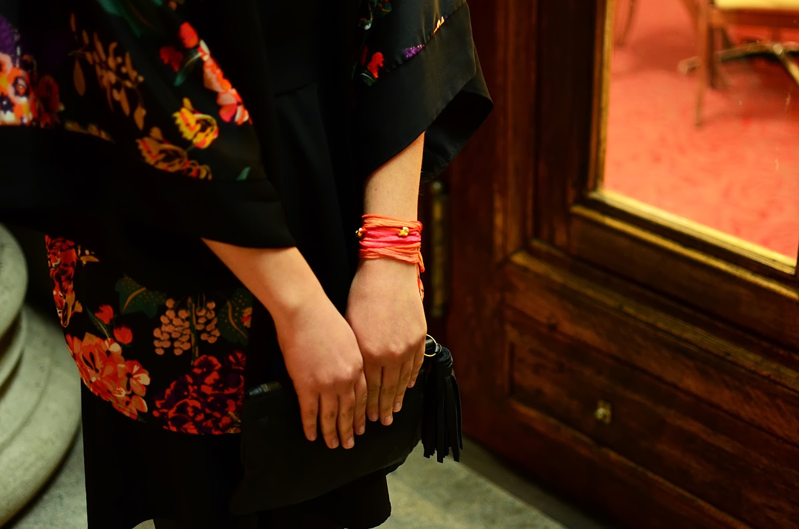 To draw the oranges out of the flowers, I added a silk wrap bracelet, but especially loved how the little skull details kept the whole ensemble from getting too cute and frilly.